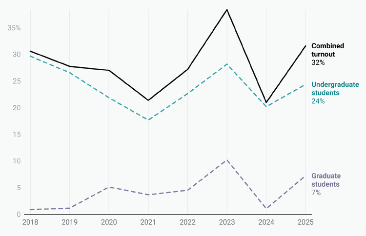 Voter turnout has fallen short for both undergraduate and graduate students. In the majority of election cycles, about one in four undergraduate students vote. Graduate student participation is much lower, averaging only four percent since 2018.